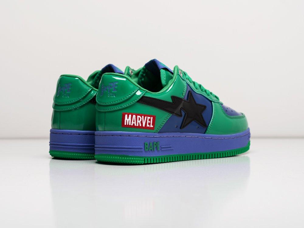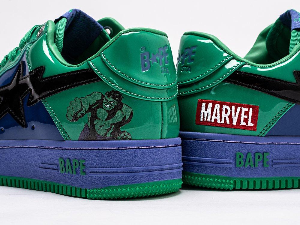 Внешний вид модели украшают фирменный логотип BAPE на боковых панелях и изображения на пятках: комиксного супергероя Халка и логотип Marvel. Это придает кроссовкам уникальный стиль и делает их ярким акцентом образа.