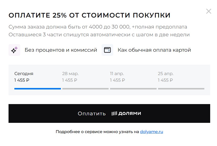 3. В появившемся окне с информацией о заказе выберите способ оплаты «Долями».