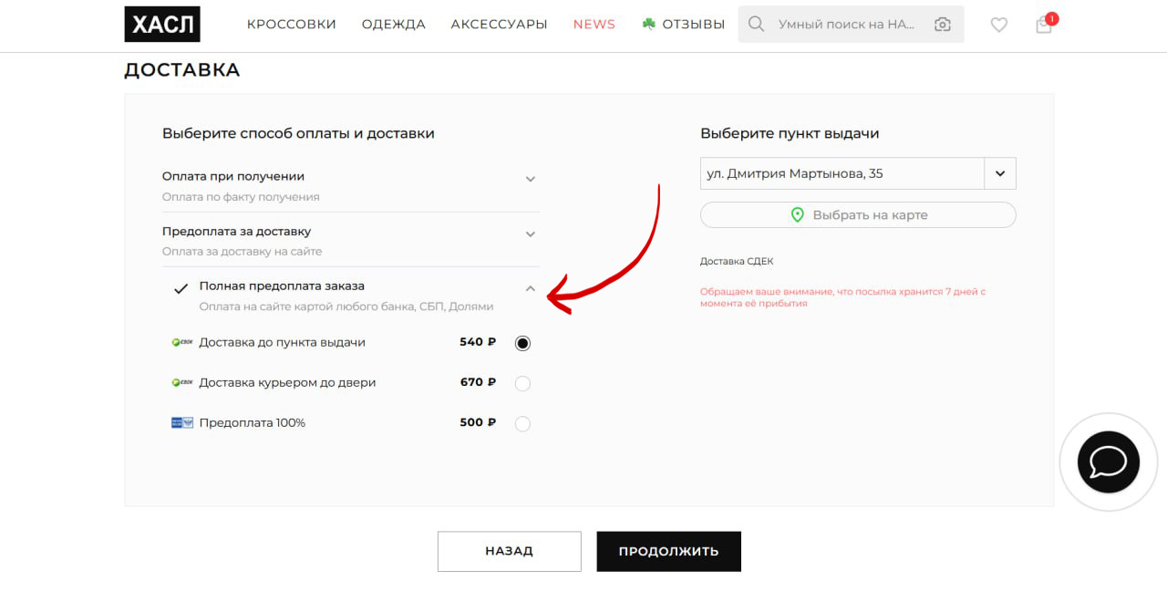 2. Чтобы оплатить заказ «Долями», необходимо выбрать способ оплаты и доставки «Полная предоплата заказа».