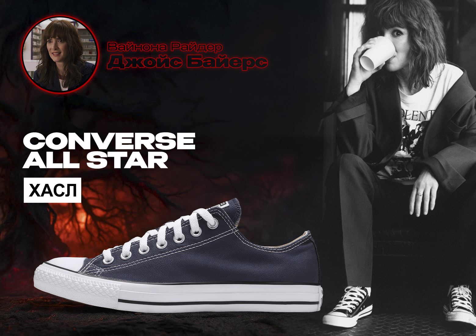 Вайнона – настоящая икона стиля 80-х и 90-х. Converse Chuck Taylor идеально подчеркивают ее винтажный шарм 👟✨. Эти классические кеды выглядят так же легко и непринужденно, как и характер Вайноны, а низкий силуэт делает их универсальными для любого повседневного образа. Идеально для прогулок по Хоукинсу и не только 😉.