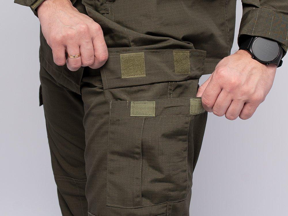 На брючинах на бедре карманы с клапаном на липучке и шнурком с лейслоком, в области