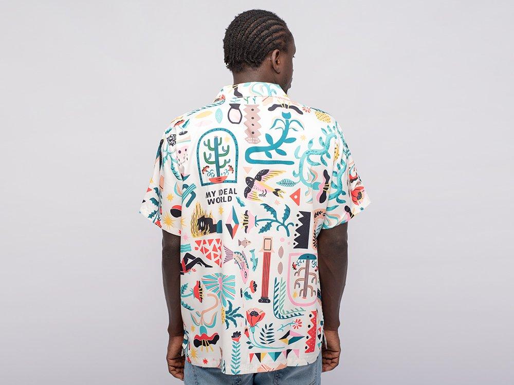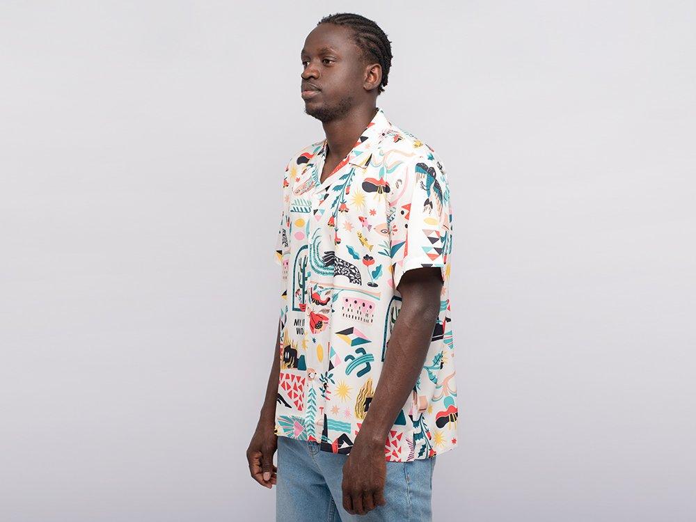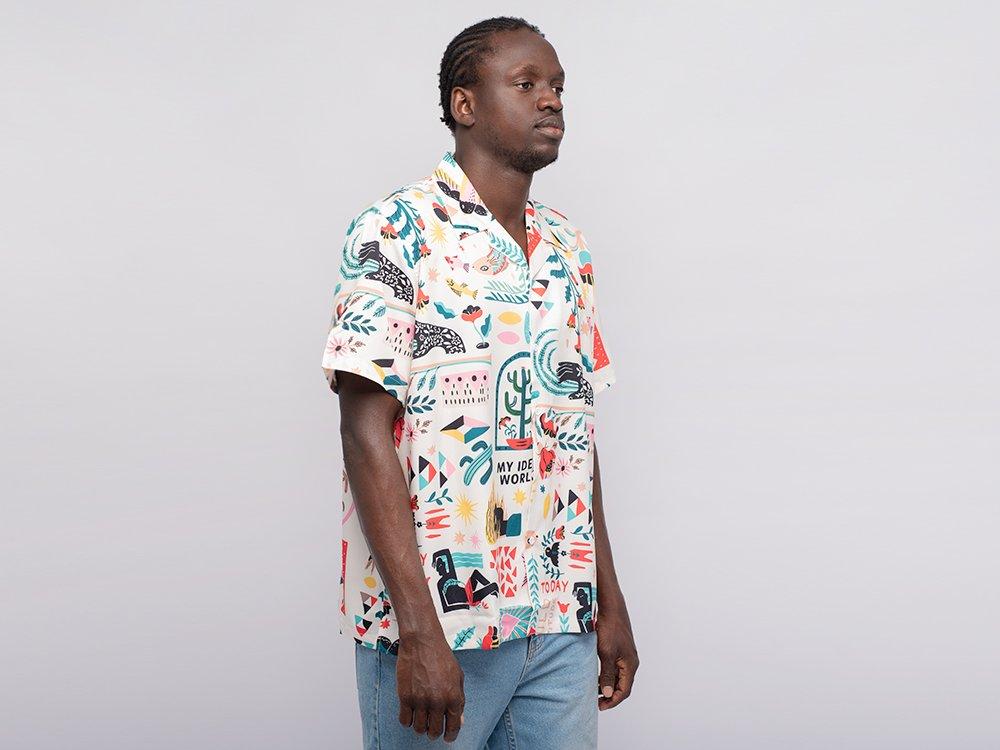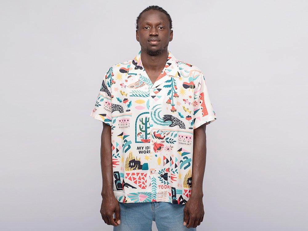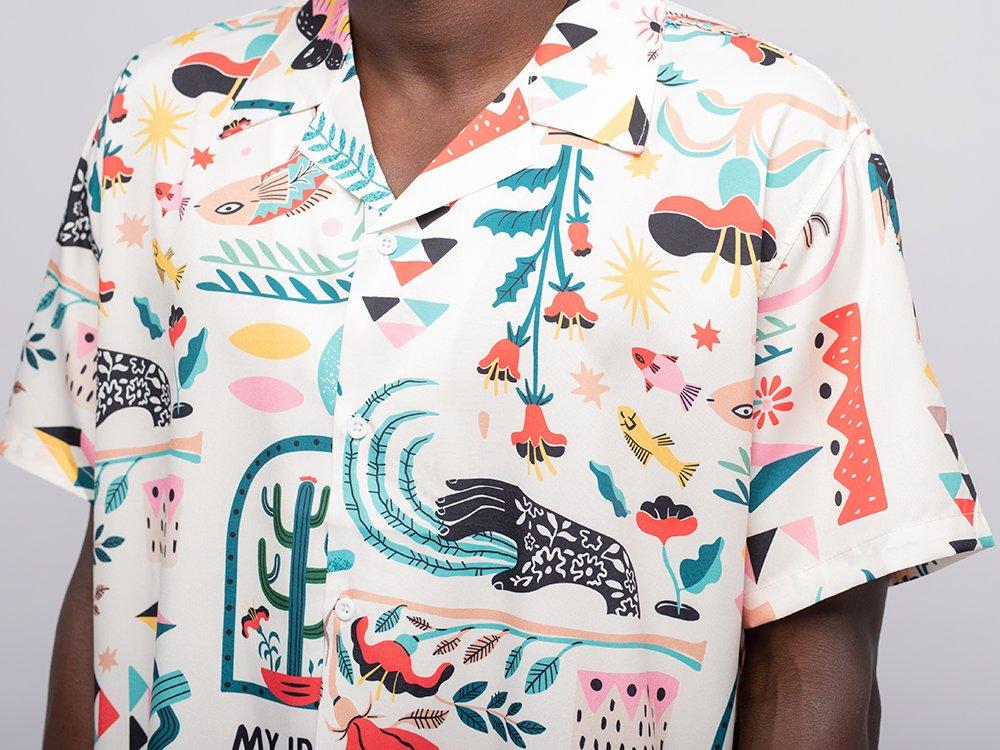 отложным воротником и коротким рукавом. Современная рубашка с графическими